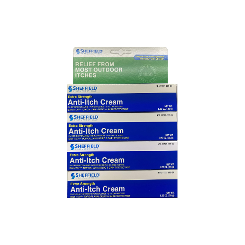 The package includes four 1.25 oz tubes of Dr. Sheffield's Anti-Itch Cream, providing fast and effective itch relief for various skin irritations.