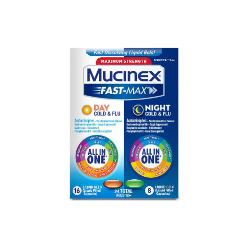 Mucinex Fast-Max Day Cold and Flu & Night Cold 24 Fast-Dissolving Liquid Gels are designed to provide powerful relief for both day and night cold and flu symptoms. The day formula helps combat congestion, coughing, and sore throat during the day, while the night formula ensures a restful sleep by alleviating nighttime symptoms, such as sneezing and runny nose. Each liquid gel dissolves quickly, providing fast-acting relief when you need it most.